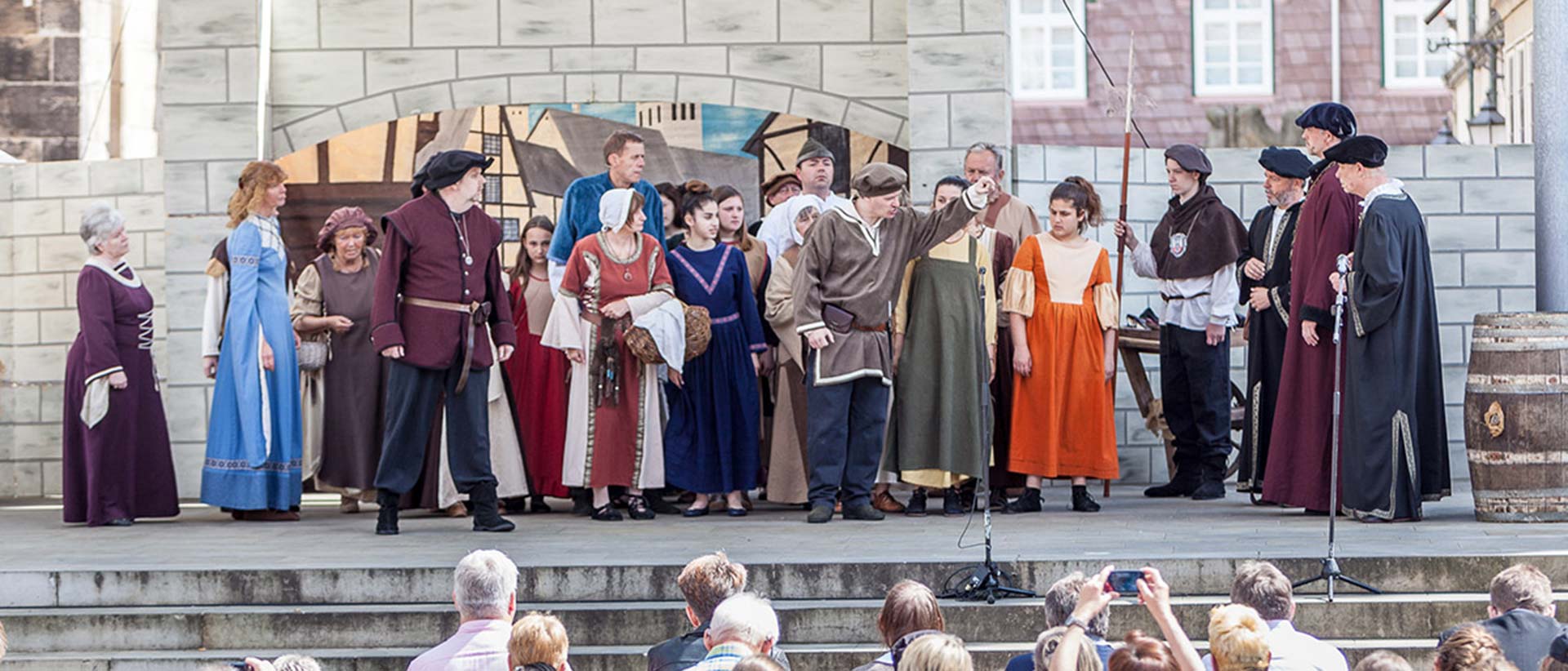 Direkt am Pferdemarkt, eingerahmt von der Marktkirche und dem Hochzeitshaus, liegt die Bühne für das Rattenfänger Freilichtspiel. Also kaum zu verfehlen.