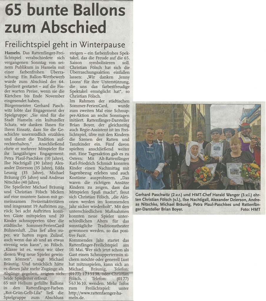 Das Rattenfänger-Freilichtspiel verabschiedete sich am 15. September von ihrem Publikum mit einer farbenfrohen Überraschung: Ein Ballon-Wettbewerb wurde zum Abschied der 64. Spielzeit gestartet – Findern winken Preise, wenn sie die Kärtchen bis Ende November eingesendet haben.