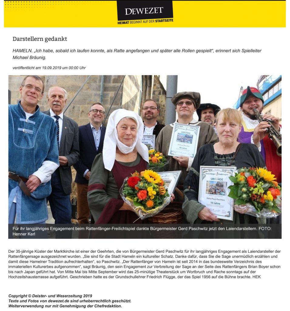 Kommendes Jahr startet das Rattenfänger-Freilichtspiel am 10. Mai. Wer sich jetzt schon als Gast einen Schnuppertermin sichern möchte oder generell Lust hat beim Hamelner Freilichtspiel mitzuspielen, Interessenten, von groß bis klein, können sich an Michael Bräunig (Tel.: 0177 / 1735138) oder Christian Fölsch (Tel. 0177 / 5633610) wenden.